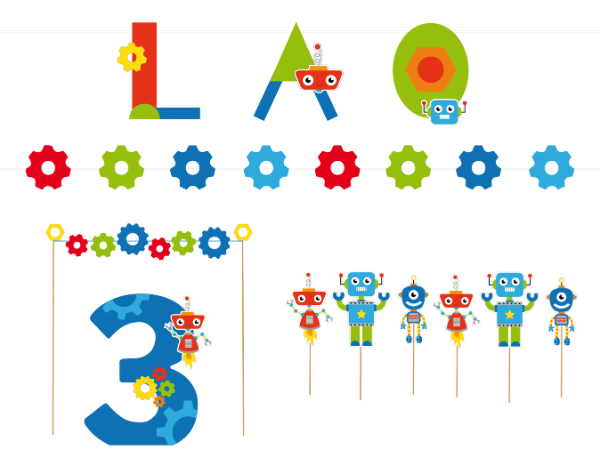 -6 toppers o pinchos para mesa (3 motivos diferentes de robots, cuerpo entero, tamaño aprox 12cm de alto + palito)